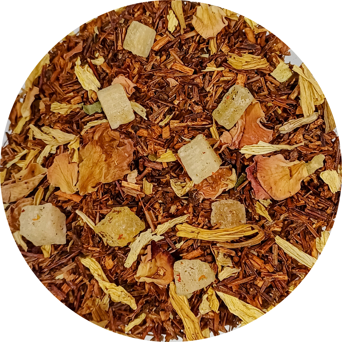 Infusión fresca y aromática a base de rooibos, con un perfil tropical equilibrado y delicadas notas cítricas y florales; rica en antioxidantes naturales, contribuye al bienestar general, al equilibrio metabólico y al apoyo en la regulación de la glucosa dentro de un estilo de vida saludable, además de aportar potencial antiinflamatorio; la presencia de matices herbales y florales brinda una sensación relajante y armoniosa, ideal para acompañar la digestión y disfrutar tanto caliente como fría; naturalmente libre de cafeína, es perfecta para cualquier momento del día.