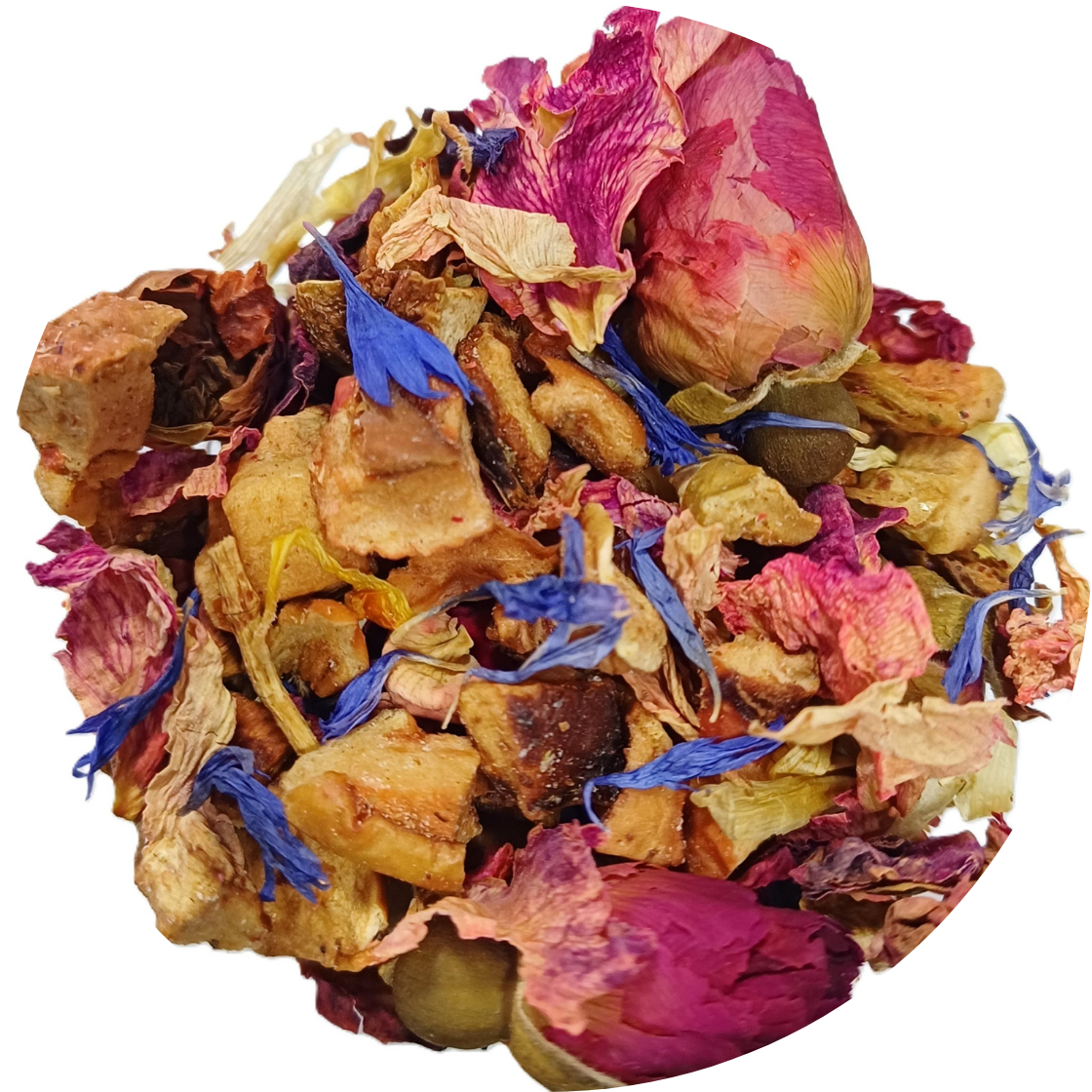 Manzana, Fresa, Frambuesa, Grosella, Botones de Rosa, Pétalos de Aciano Azul, Flor de Jazmín y Escaramujo